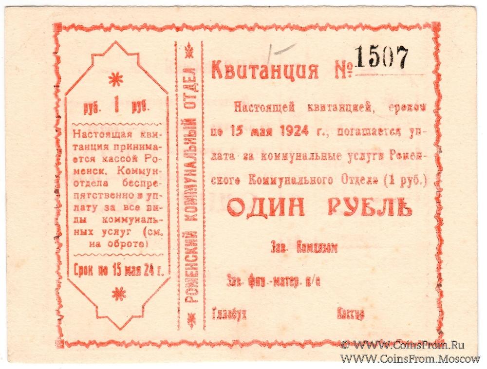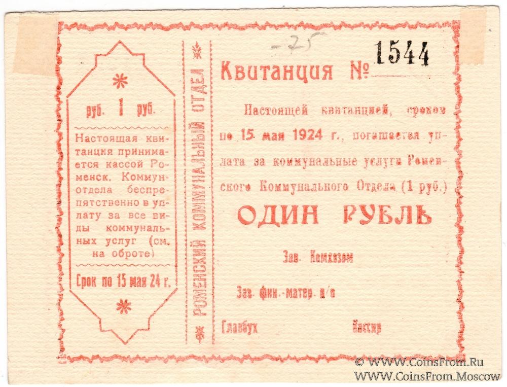 Квитанция. БРАК: на обеих сторонах аверс с разными номерами. Роменский Коммунальный Отдел.