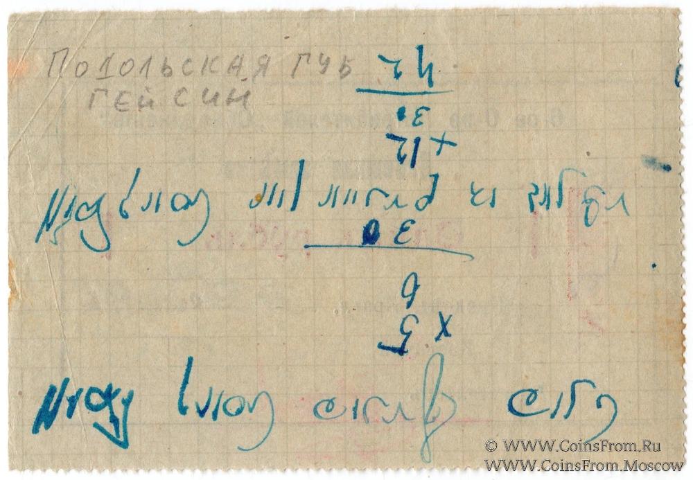 Денежная заметка без даты. Без подписи казначея и печати. Бумага в клетку. 6-е Общество потребителей "Объединение".