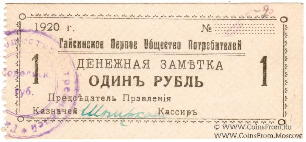 Денежная заметка 1920 г. Водяной знак - "паркет". Номер 1-значный. Гайсинское Первое Общество потребителей.