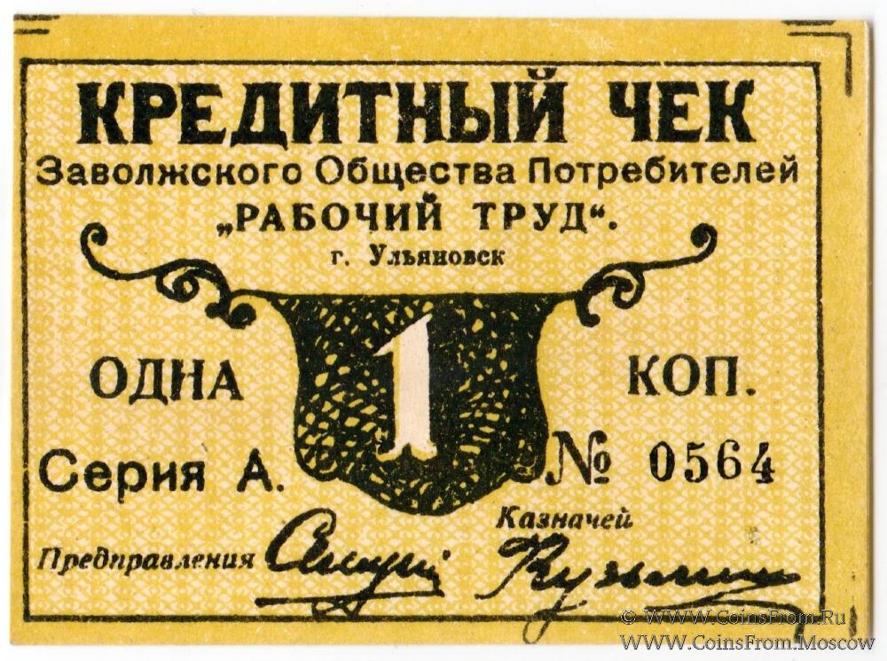 Кредитный чек без даты. Заволжское Общество Потребителей "Рабочий труд".