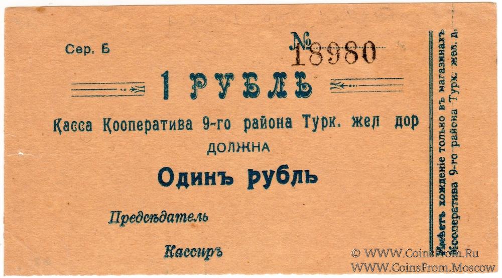 Серия Б. Номер 5-значный, мелкий (6 мм). Касса Кооператива 9-го района Туркестанской железной дороги.
