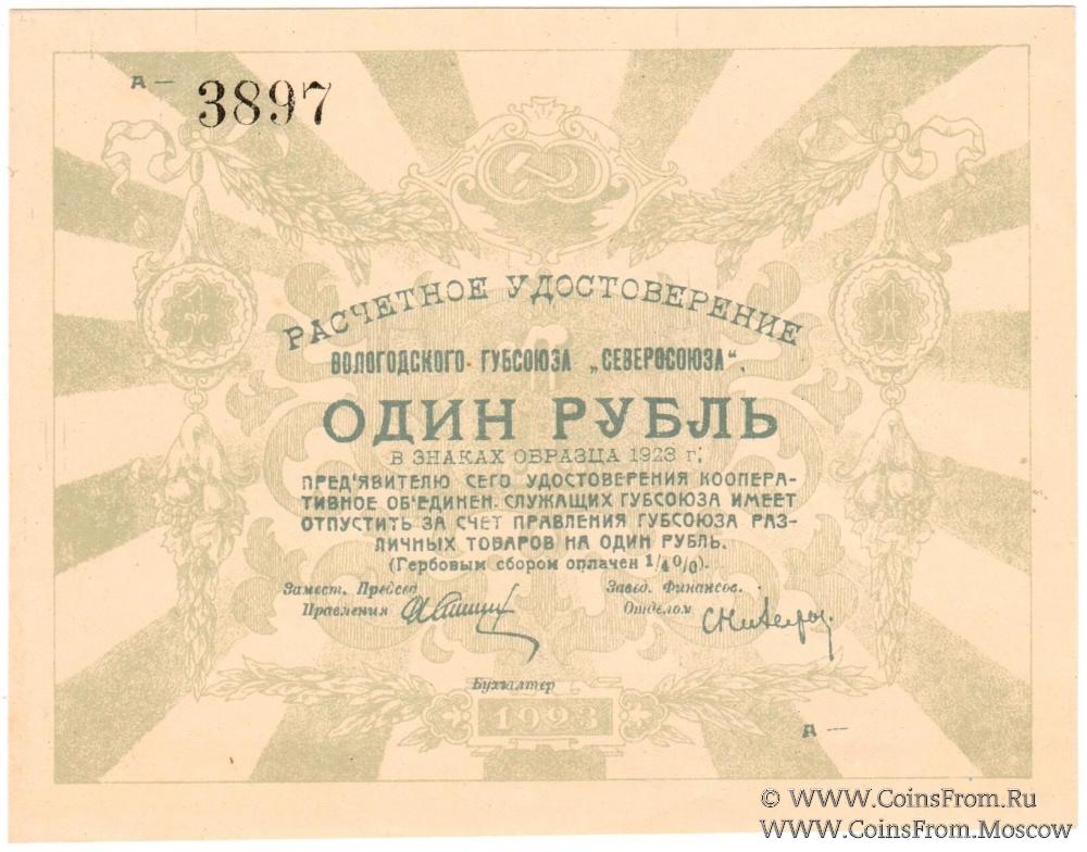 Расчетное удостоверение 1923 г. Серия А. Номер слева сверху 4-значный. Вологодский Губсоюз "Северосоюз".