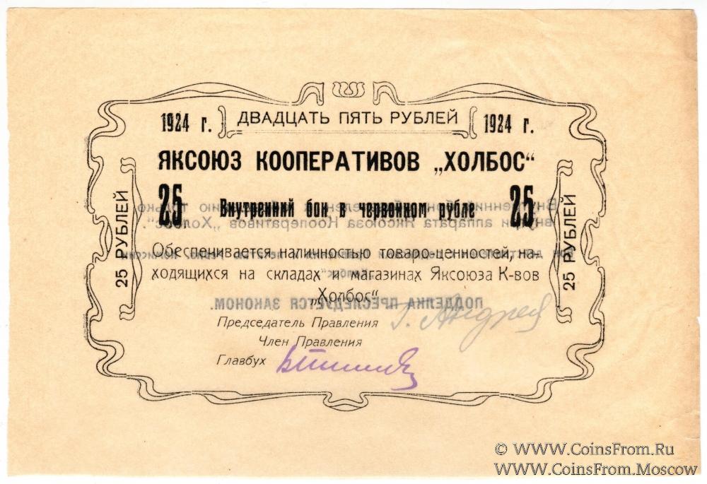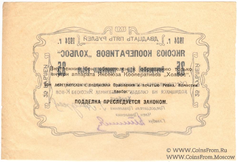 Внутренний бон в червонном рубле. Без печати и подписи члена правления на аверсе. Яксоюз кооперативов "Холбос".