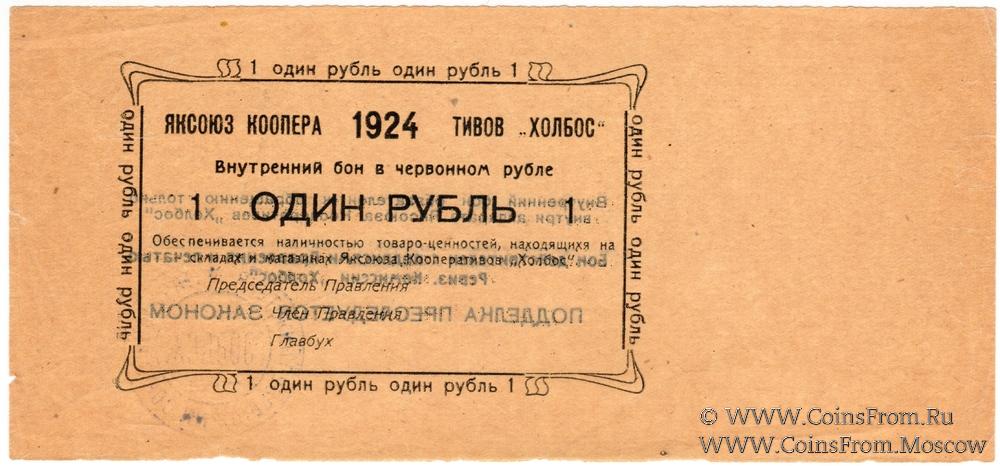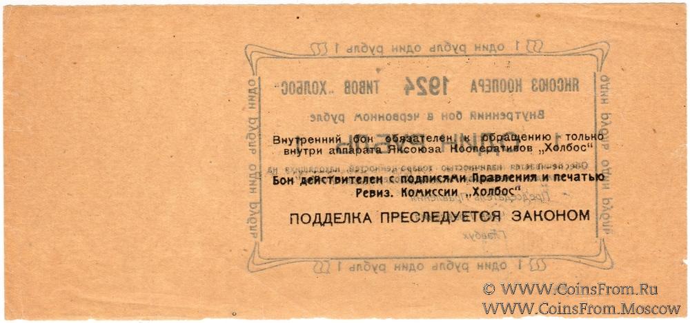 Внутренний бон в червонном рубле. С печатью, с полем справа (не обрезан край листа). Бумага жёлтого оттенка. Яксоюз кооперативов "Холбос".