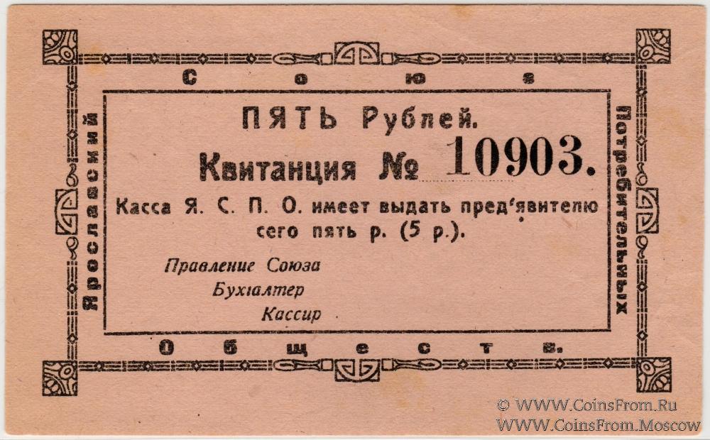 Квитанция без даты (1918 г.). Бланк с номером. Ярославский союз потребительских обществ (Я.С.П.О.).