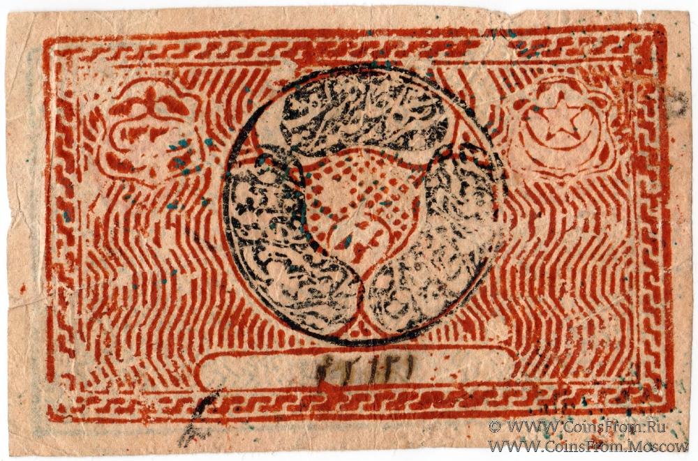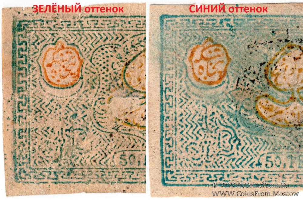 Бумажные деньги. 50 теньгов 1920 (1338) г. (новый тип). Бумага белая, верже. Зелёный оттенок аверса. Печати-подписи в круге.