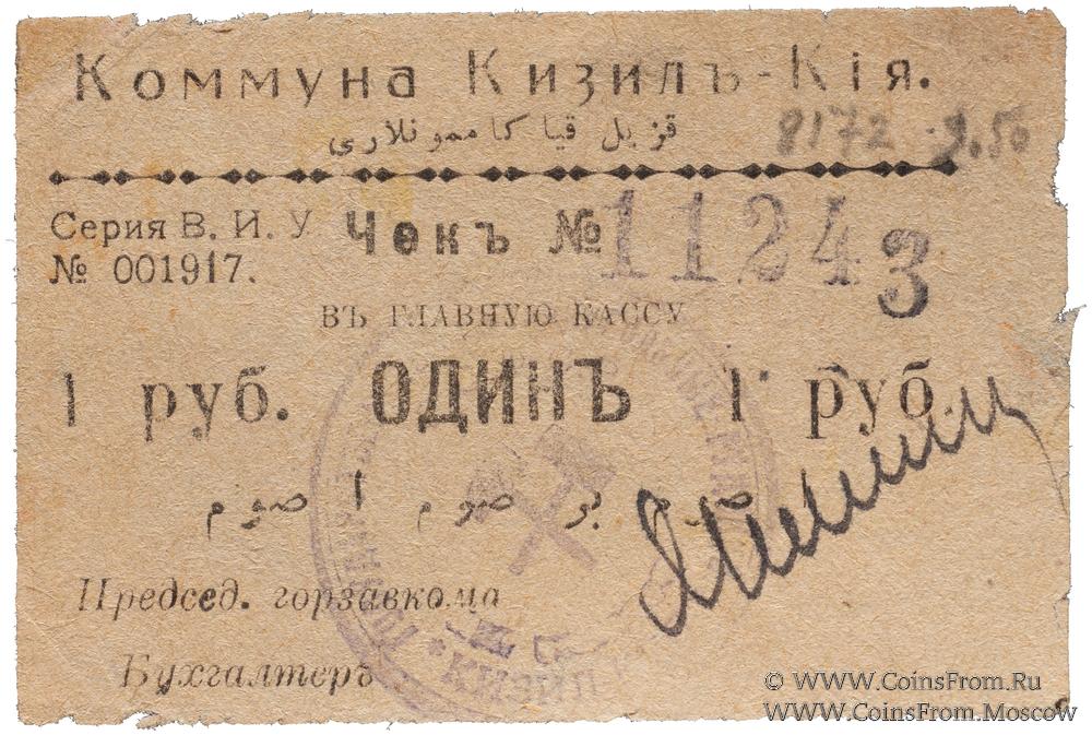 Чек в главную кассу. Без зубцов. С оттиском печати, с подписью. Шрифт чёрный. Коммуна Кизил-Кия.