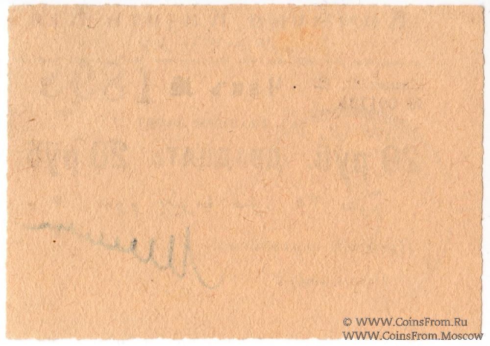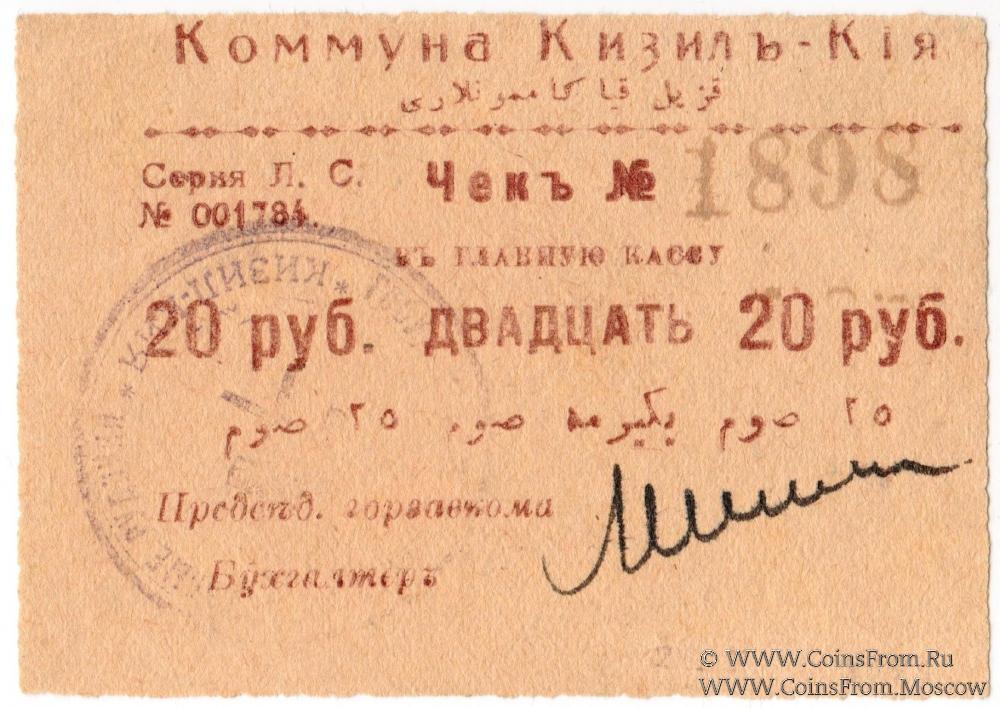 Чек в главную кассу. С оттиском печати, с подписью от руки. Шрифт коричневый. Коммуна Кизил-Кия.