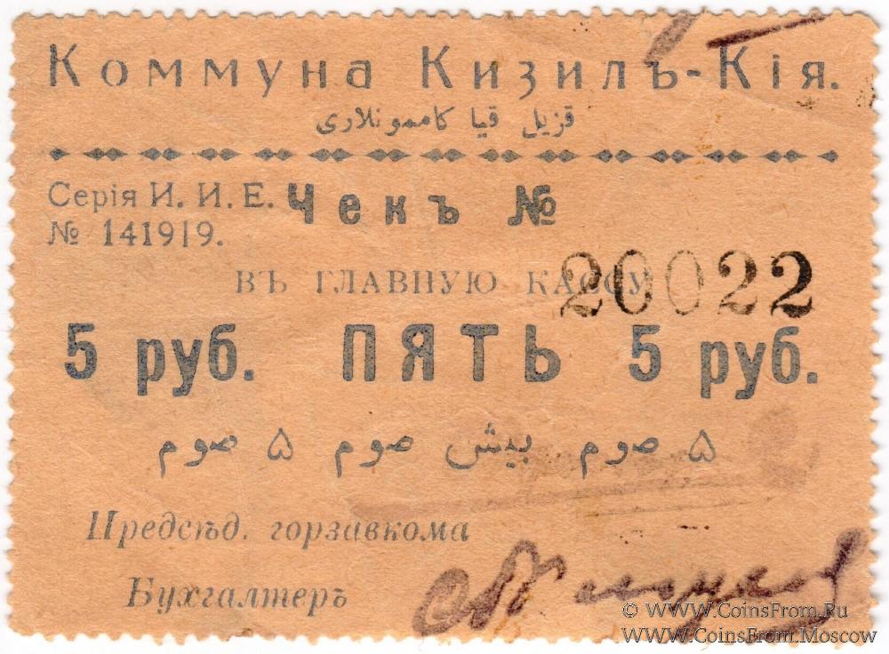 Чек в главную кассу. С зубцами с 4-х сторон. Без печати, шрифт синий. Номер 5-значный. Коммуна Кизил-Кия.