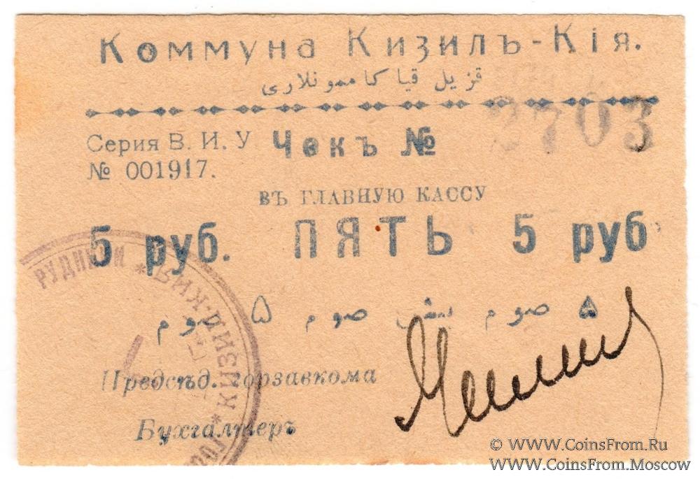 Чек в главную кассу. Без зубцов. С оттиском печати, с подписью. Шрифт синий. Коммуна Кизил-Кия.