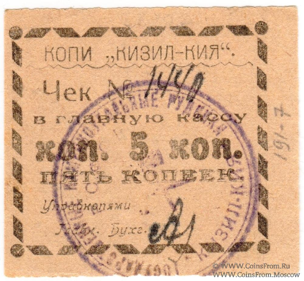 Чек в главную кассу без даты (1918 г.). Номер и подписи от руки. Печать фиолетовая. КОПИ "Кизил-Кия" (Управление).