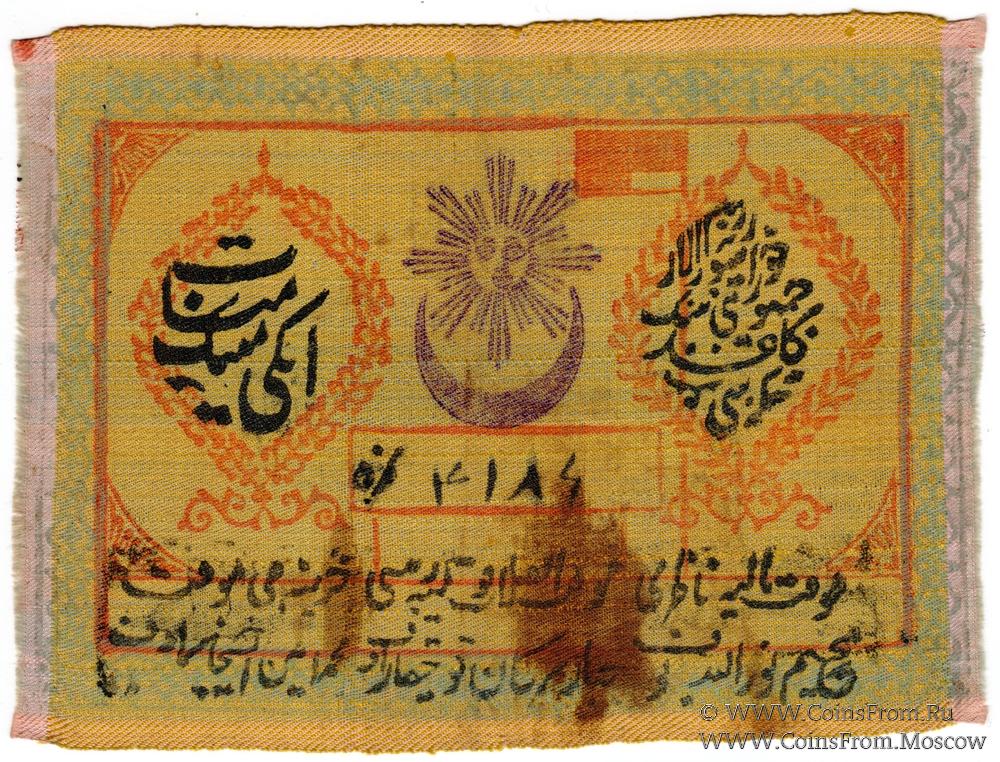 Выпуск 1921 г. (1339 / ١٣٣٩) на шёлке. Печати-подписи без рамки. Временный Председатель РевКома - Джабар Берган Кучкаров.