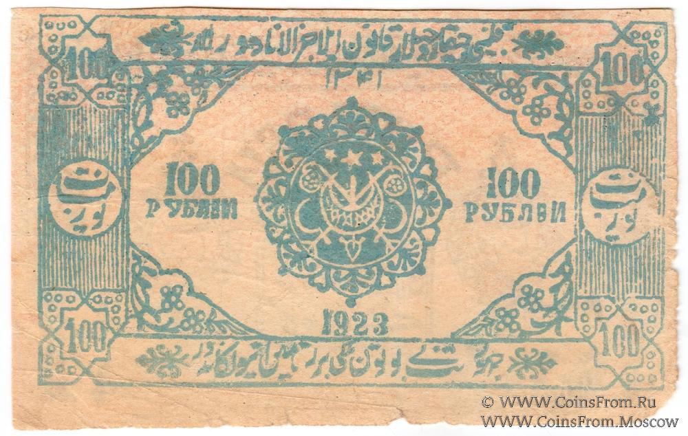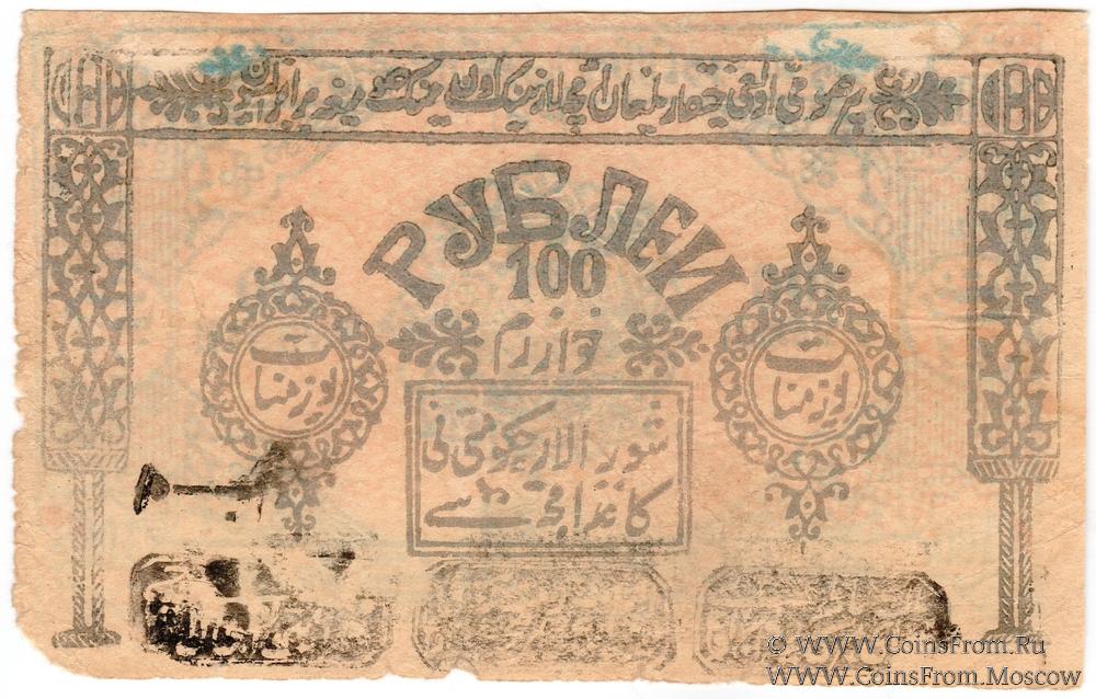 Расчетный знак Хорезмской Народной Советской республики. 100 рублей рублей 1923 (١٣٤١ / 1341) г. Без водяного знака. Вариант 2 по форме печатей.