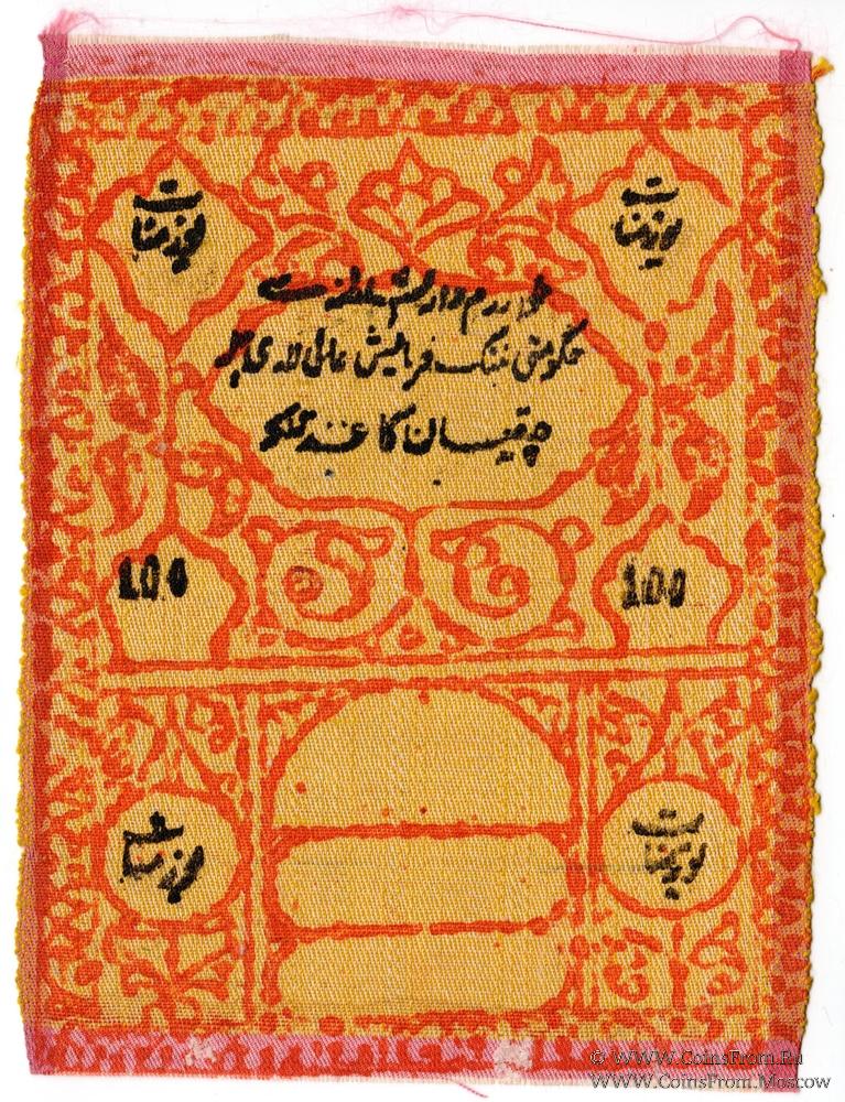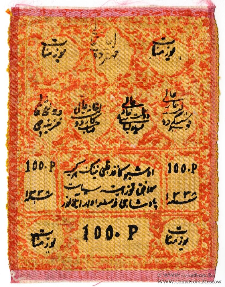 Выпуск 3 на шёлке. Бланк. Номинал "100 р" на аверсе мелко. Правительство Падишаха Сеид-Абдуллы-Хана (خانان خیوہ).