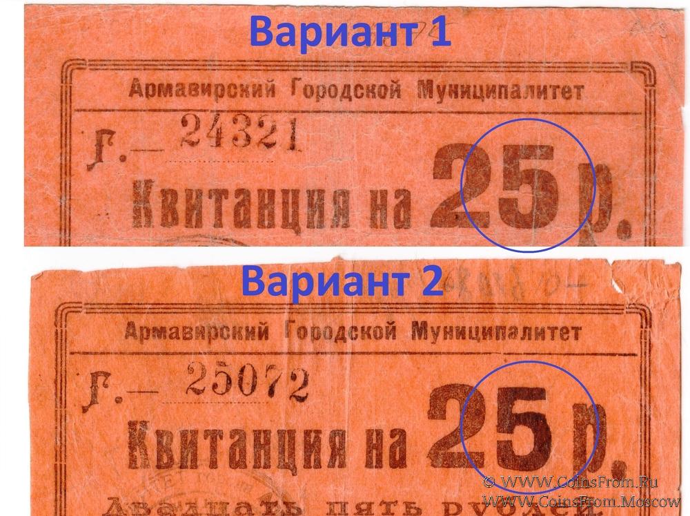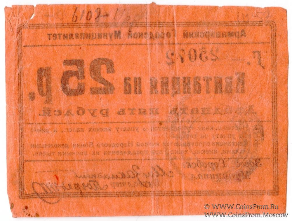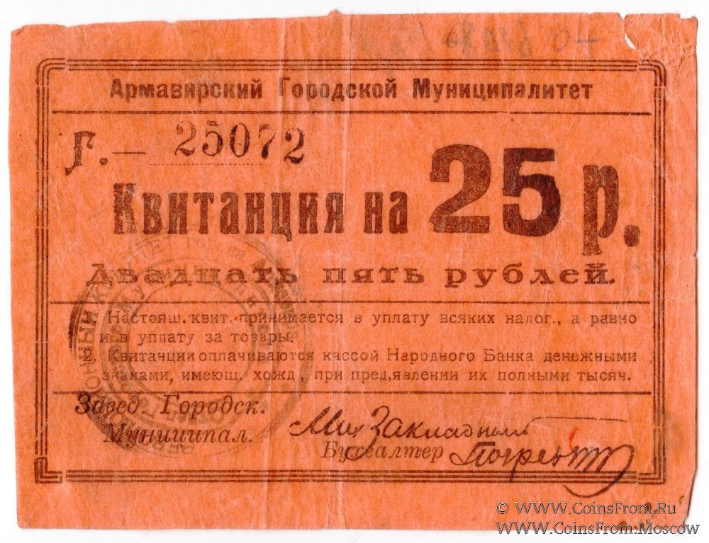 Квитанция 1919 г. На тонкой оранжевой бумаге. Вариант 2 написания цифры "5" в номинале "25". Армавирский Городской Муниципалитет.
