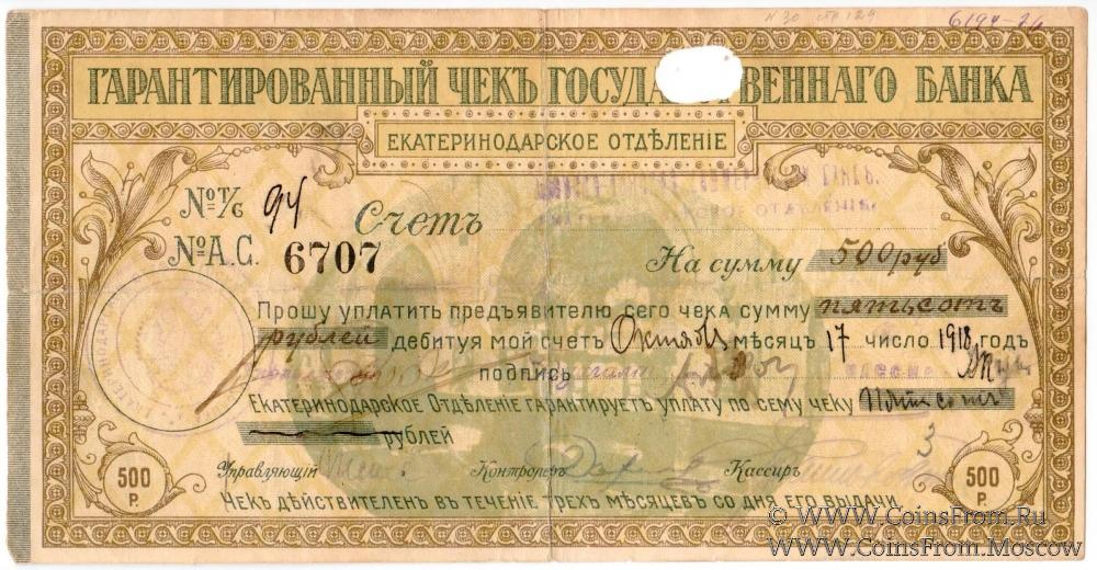 Печать: большой орел, текст: "Екатеринодарское отдъл. Государственнаго Банка".