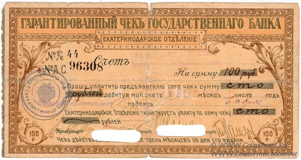 Печать: малый орел, текст: "Екатеринодар.отд. * Государственный Банкъ *".