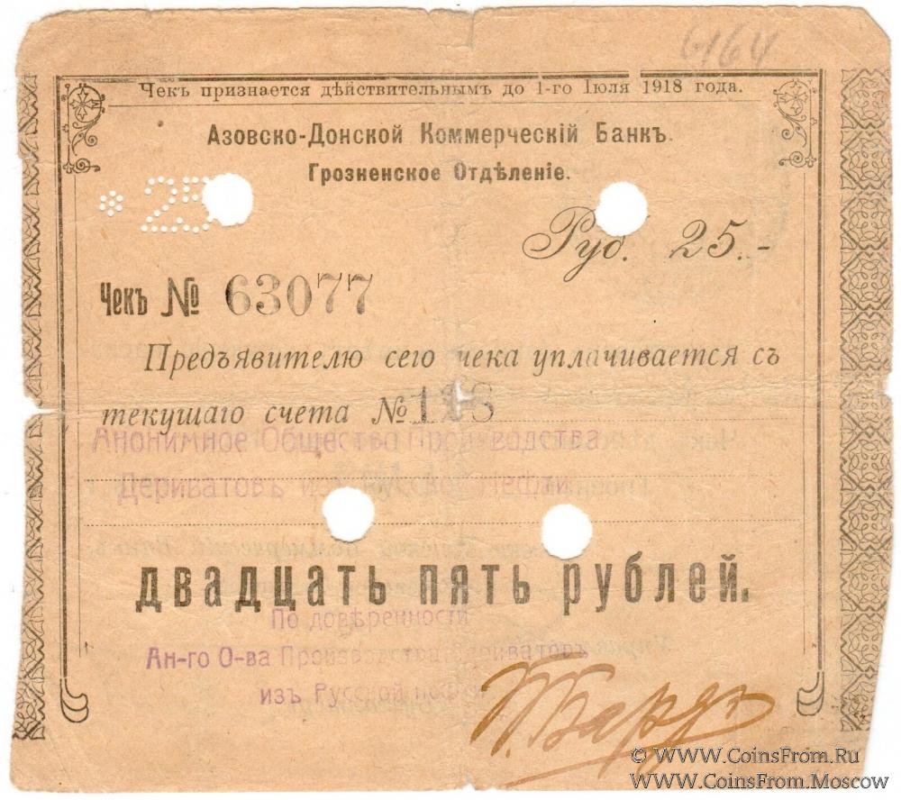 Чек 1918 г. Действителен до 1 июля 1918 г.