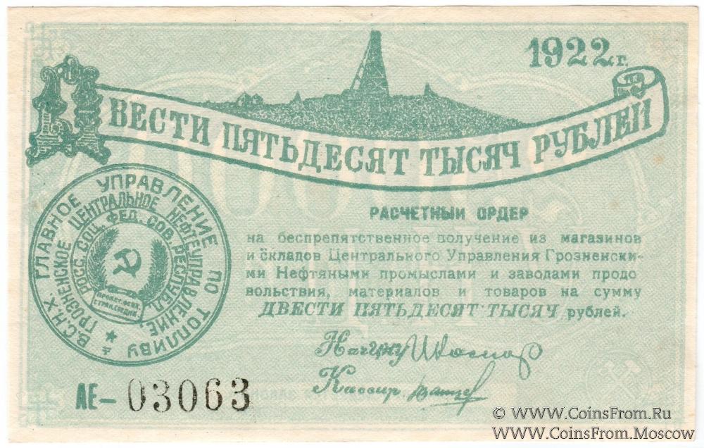 Расчетный ордер 1922 г. В.С.Н.Х. Главного управления по топливу. Грозненское центральное нефтяное управление. Грознефть.
