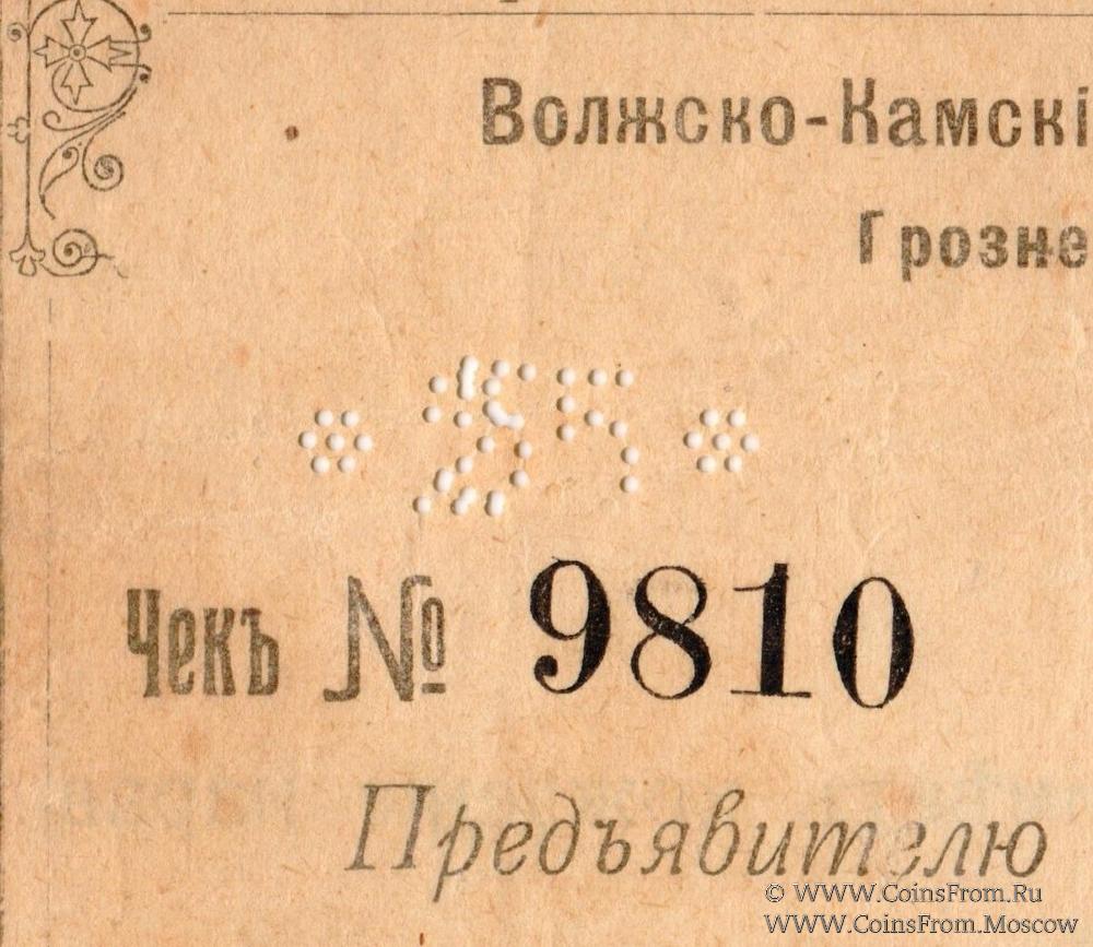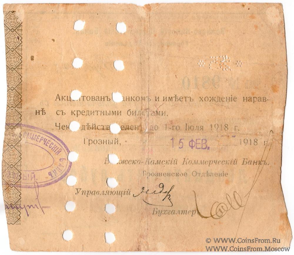 Чек 1918 г. Действителен до 1 июля 1918 г. БРАК: двойная цифра "5" в перфорации "*255*". Рамка 2 типа. Гашение. Без опечатки в слове "…хожденiЕ…". "Общество Грозненскаго Нефтяного Производства п.ф. I.А.АХВЕРДОВЪ и Ко" (счет № 72). Волжско-Камский Коммерческий Банк.