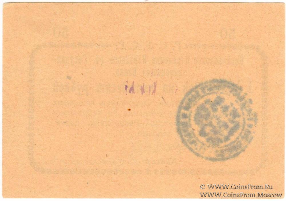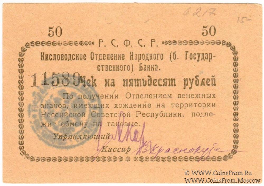 Чек (1919). "Р.С.Ф.С.Р." вместо орла. Номер 5-значный. Кисловодское Отделение Народного (б. Государственного) Банка.