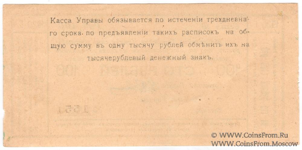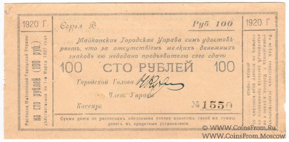 Расписка 1920 г. Серия В. Номер 4-значный. Без подписей Члена Управы и Кассира на аверсе. Майкопская Городская Управа.