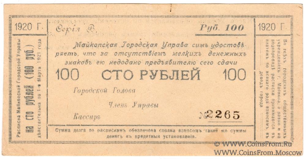 Расписка 1920 г. Серия В. Бланк. Майкопская Городская Управа.
