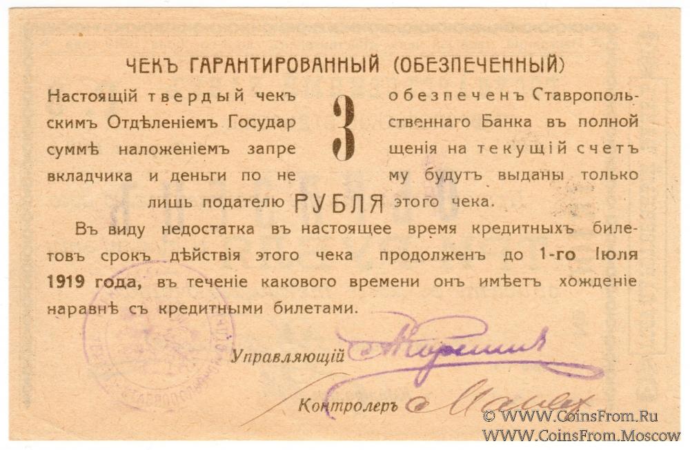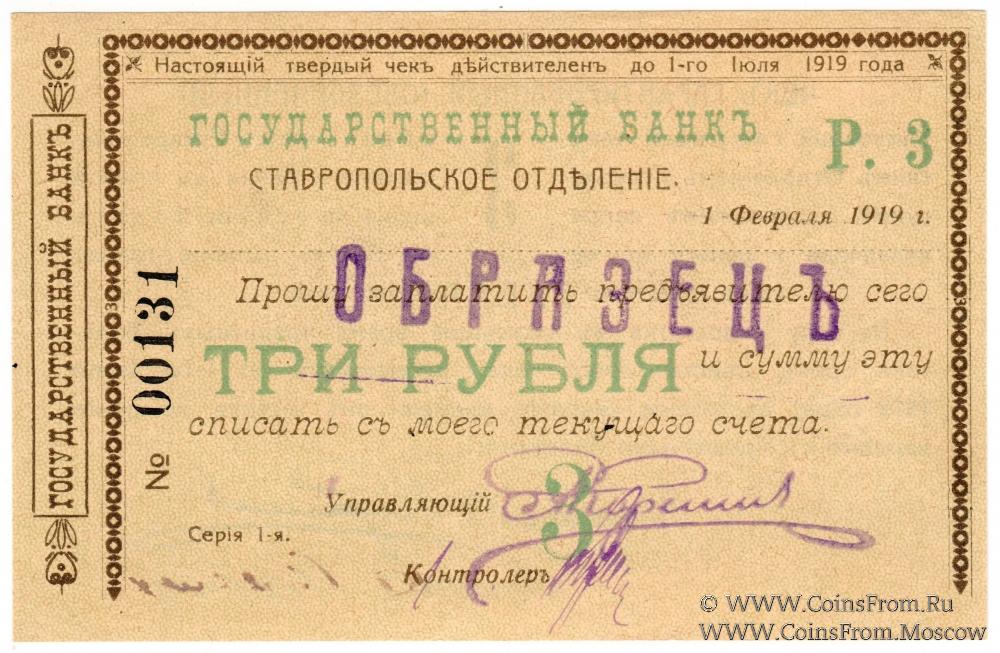 Чек 3 рубля 1919 г. (Ставрополь) ОБРАЗЕЦ