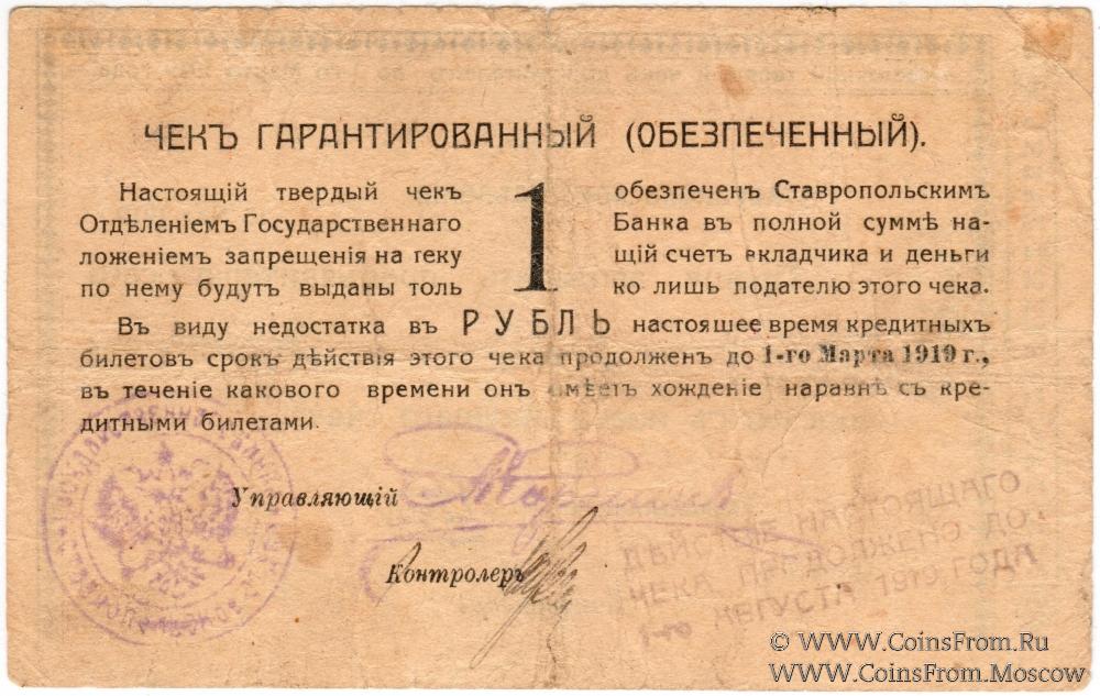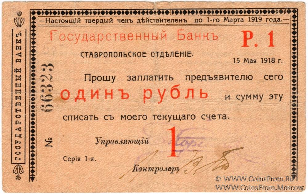 Серия 1 (действителен до 1 марта 1919 г.). Штамп продления на реверсе до 01 августа 1919 г. Обеспечен текущим счетом вкладчика. Ставропольское Отделение Государственного Банка.