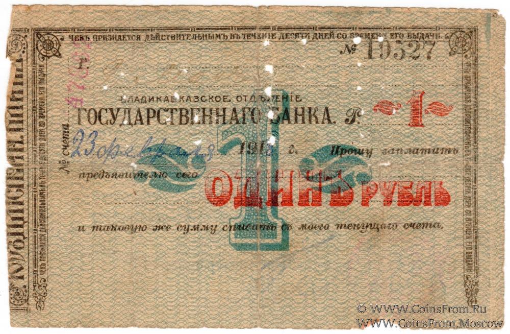 Чек. Синий, с текстом в рамке. Погашен перфорацией "14 ГБ". Владикавказское Отделение Государственного Банка.