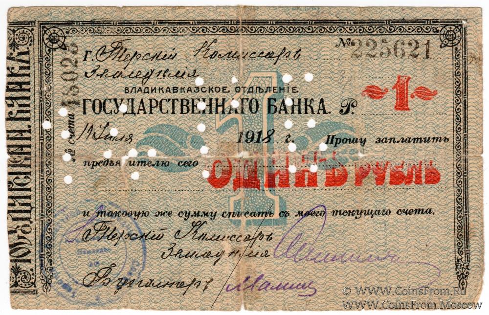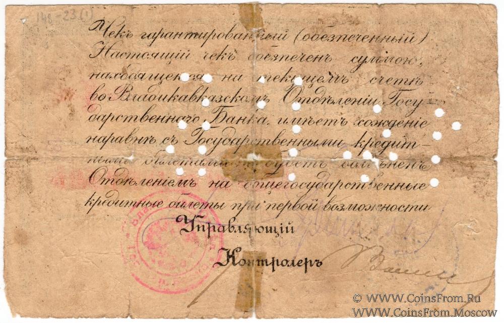 Чек. Синий, без текста в рамке. Счет "Терскiй Комиссаръ Земледелiя". Погашен перфорацией "14 ГБ". Владикавказское Отделение Государственного Банка.