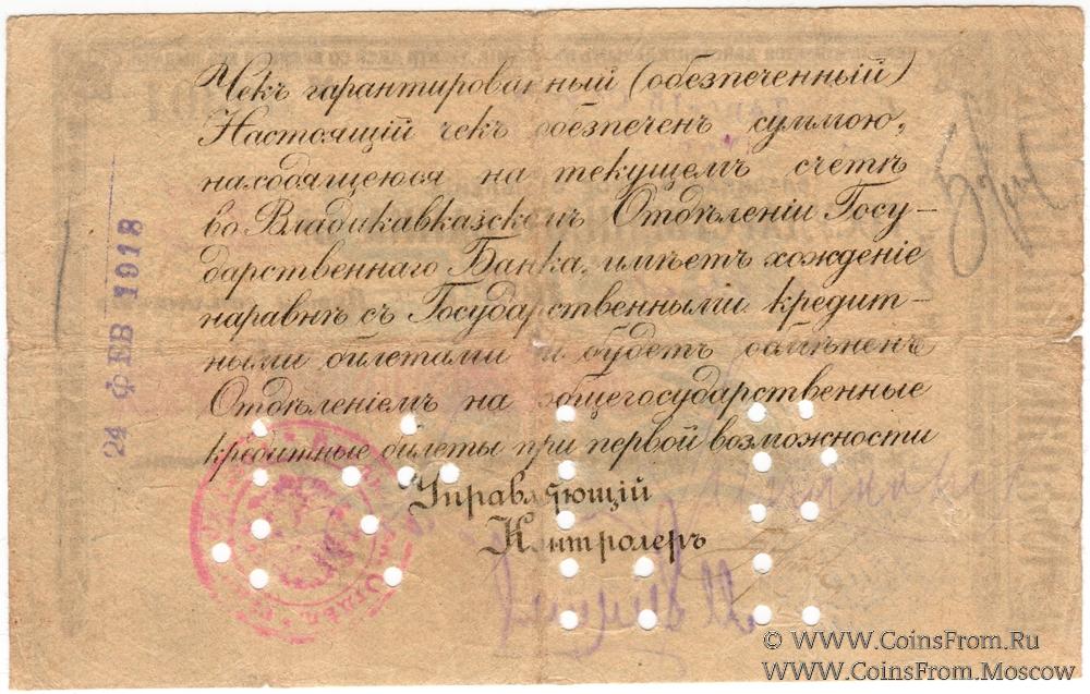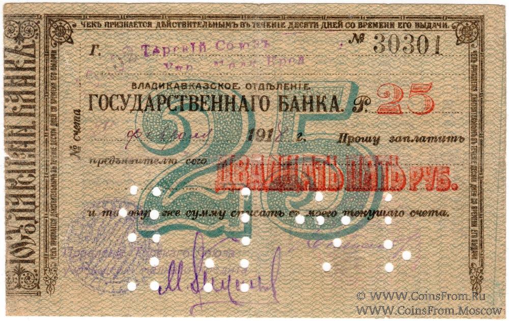 Чек. Синий, с текстом в рамке. Погашен перфорацией "14 ГБ". Владикавказское Отделение Государственного Банка.