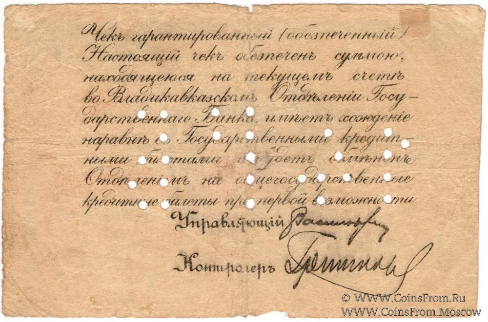 Чек. Синий, рамка без текста. Бланк. На реверсе подписи факсимиле. Погашен перфорацией "14 ГБ". Владикавказское Отделение Государственного Банка.