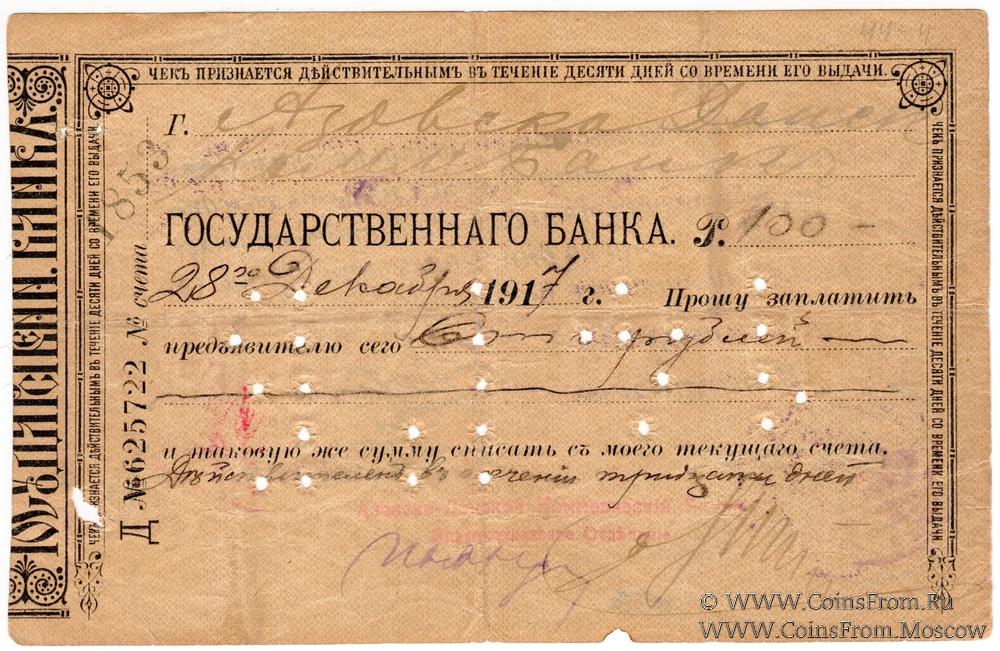 Чек от 28.12.1917 г. Серия Д. Перфорация "14 ГБ". Счет "Азовско-Донской Коммерческiй Банкъ". Владикавказское Отделение Государственного Банка.