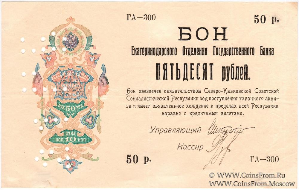 "Бон обеспечен обязательством Северо-Кавказской Советской Социалистической Республики под поступления табачного акциза и имеет обязательное хождение в пределах всей Республики наравне с кредитными билетами".