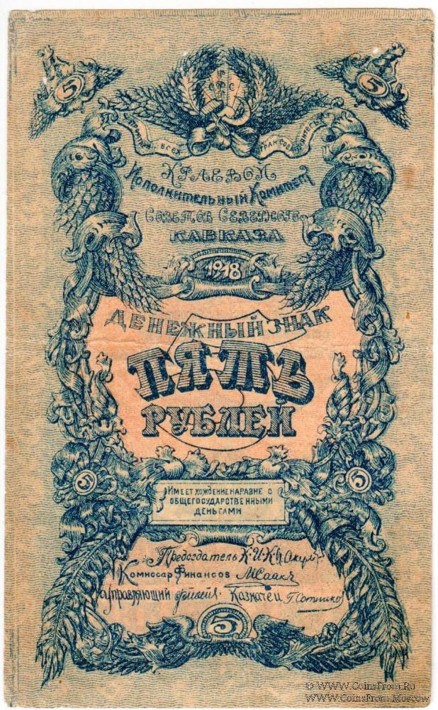 Денежный знак 1918 г. Серия А. Краевой Исполнительный Комитет Советов Северного Кавказа.