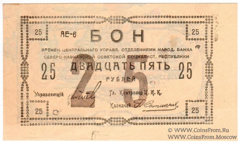 Бон 1918 г. БРАК: реверс перевернут. Аверс без фона. Коричневая "25" на аверсе. Бумага желтая. Временное Центральное Управление Отделениями Народного Банка.