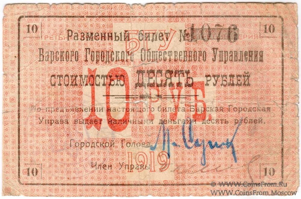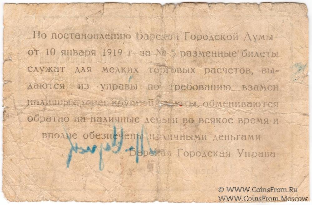 Разменный билет. Цифры года меньше. На аверсе украинская печать ("тризубец"). Барское Городское Общественное Управление.