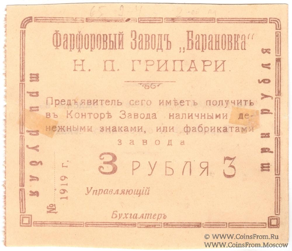 Бон. Бланк. Фарфоровый Завод "Барановка" Н.П. Грипари.