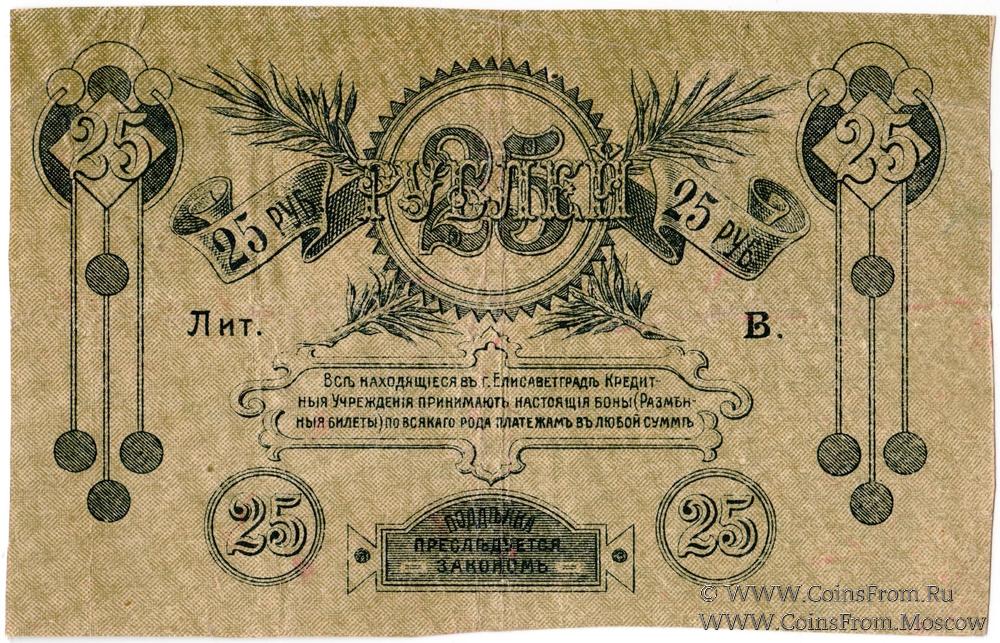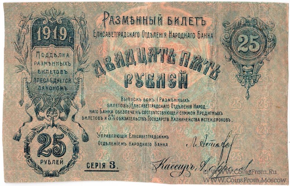Разменный билет 1919 г. Cерия 3 (аверс), литера В (реверс). Без номера. Елизаветградское Отделение Народного Банка.