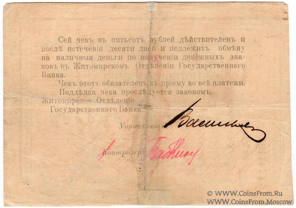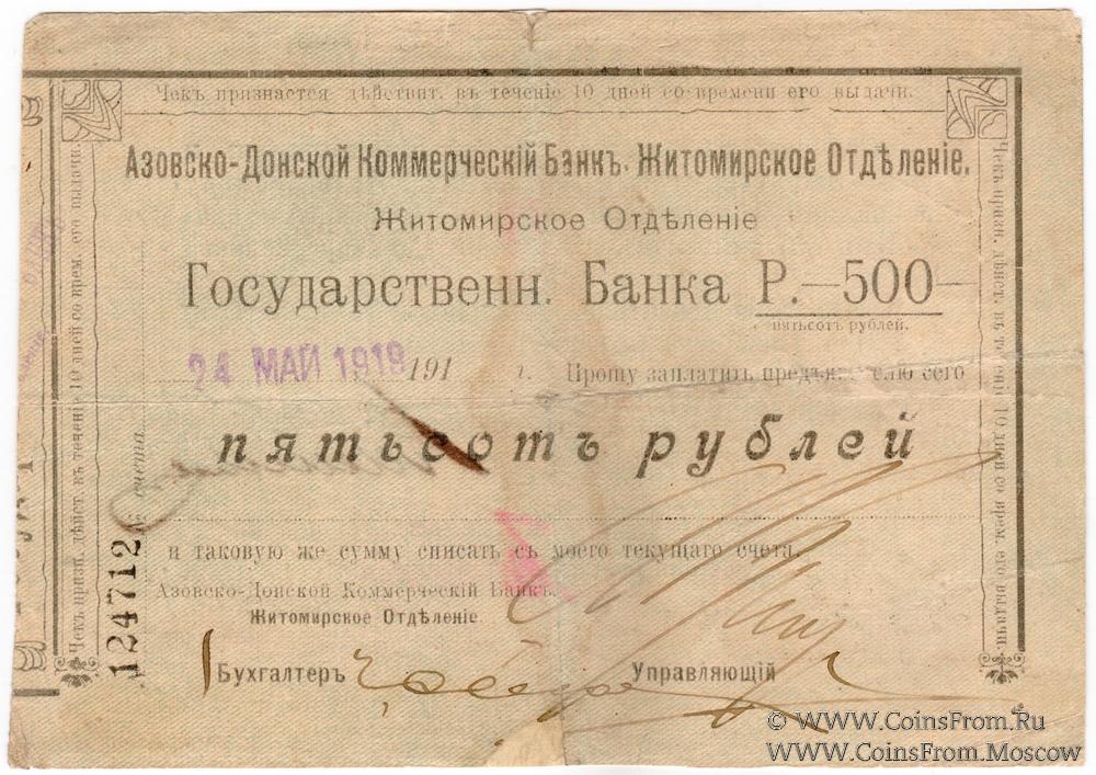 Чек 1919 г. Дата (24.05.1919) штампом. Номер черный. Без водяных знаков.