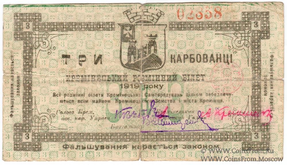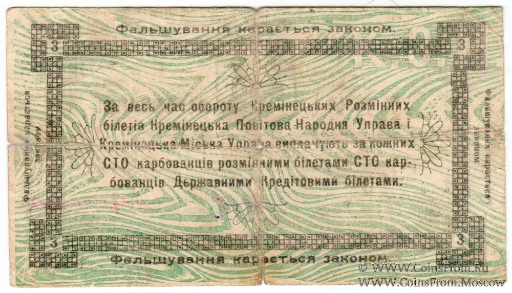 Разменный билет. Номер красный. Уездная Народная Управа и Кременецкая Городская управа.