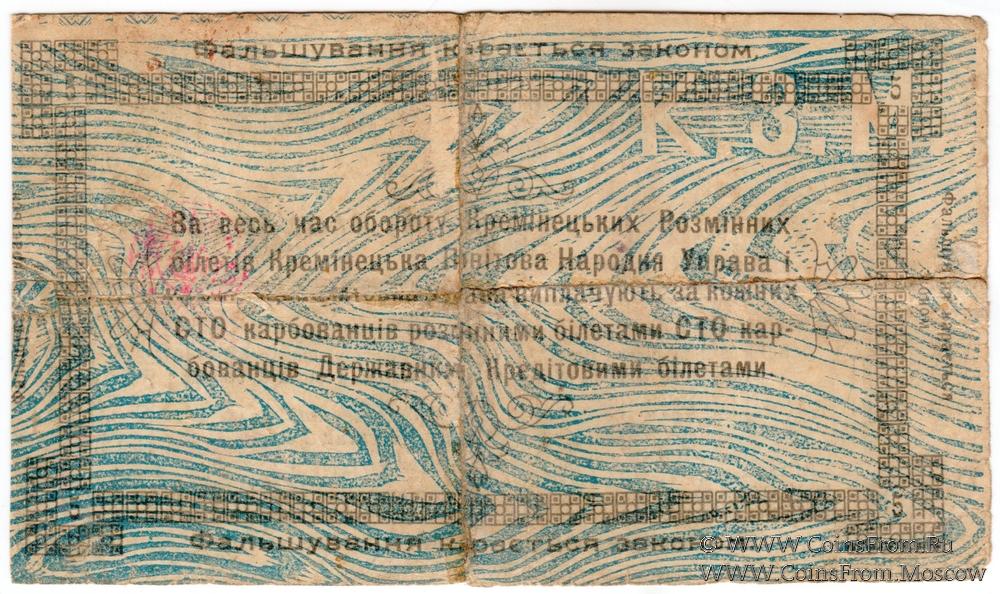 Разменный билет. Номер красный. Уездная Народная Управа и Кременецкая Городская управа.