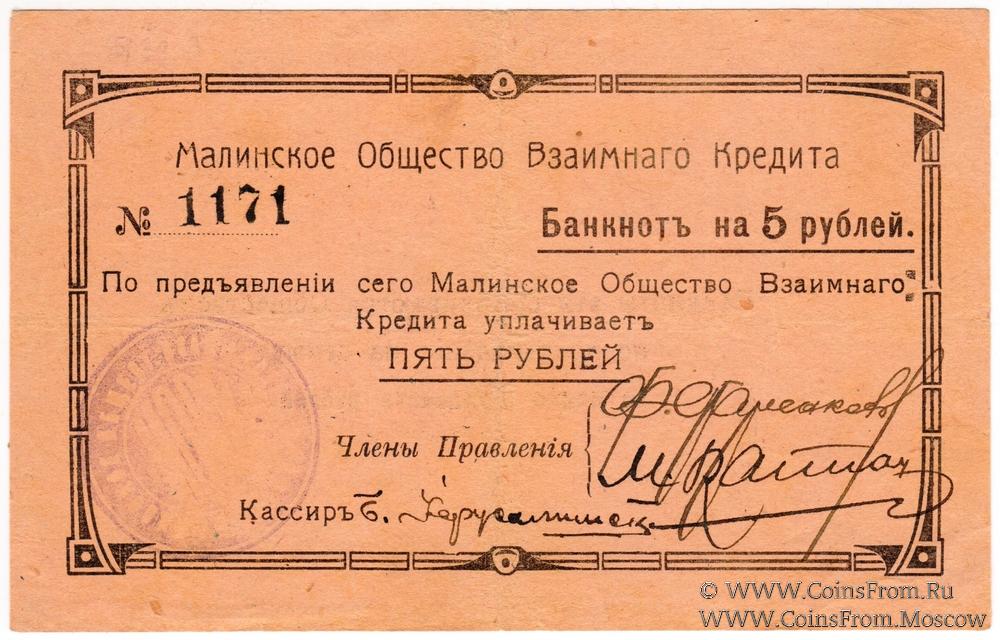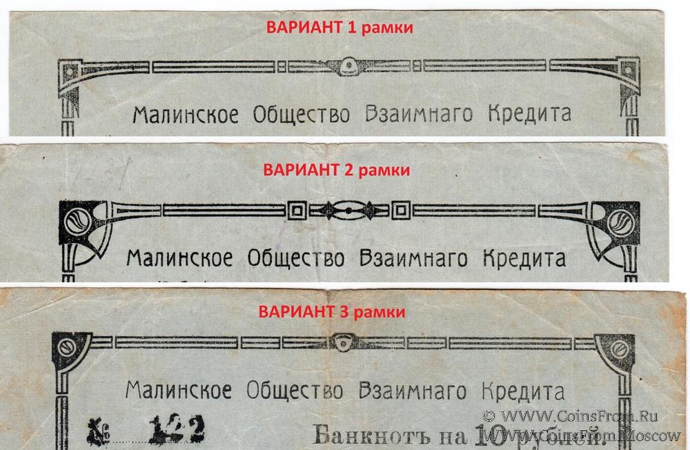 Банкнот без даты (1918 г.). Вариант 1 рамки. Малинское Общество Взаимного Кредита.