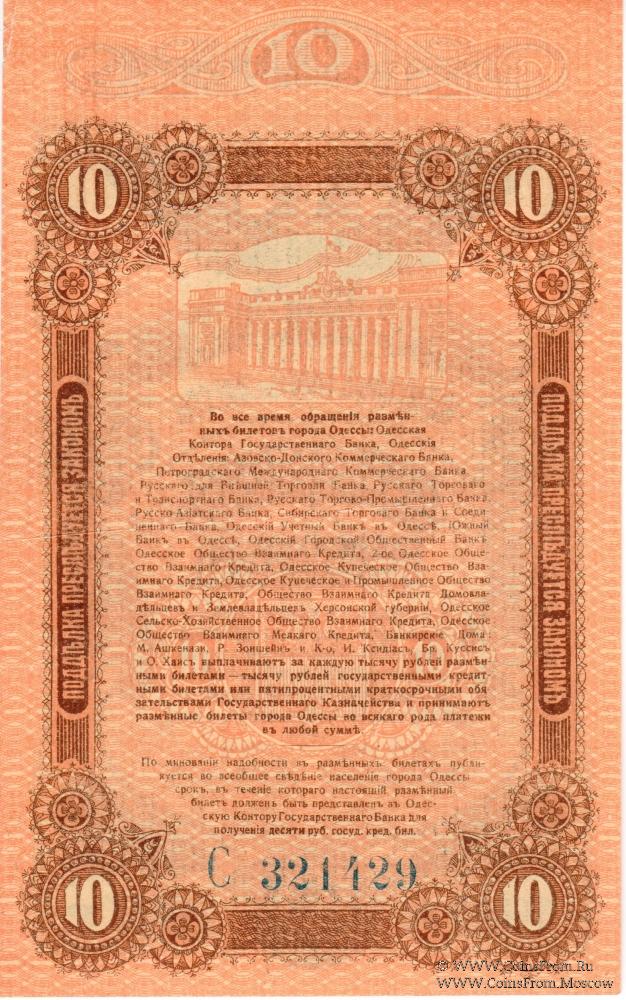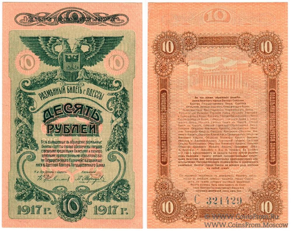 Разменный билет г. Одессы 1917 г. Серия и номер синие на реверсе. Городское Самоуправление.
