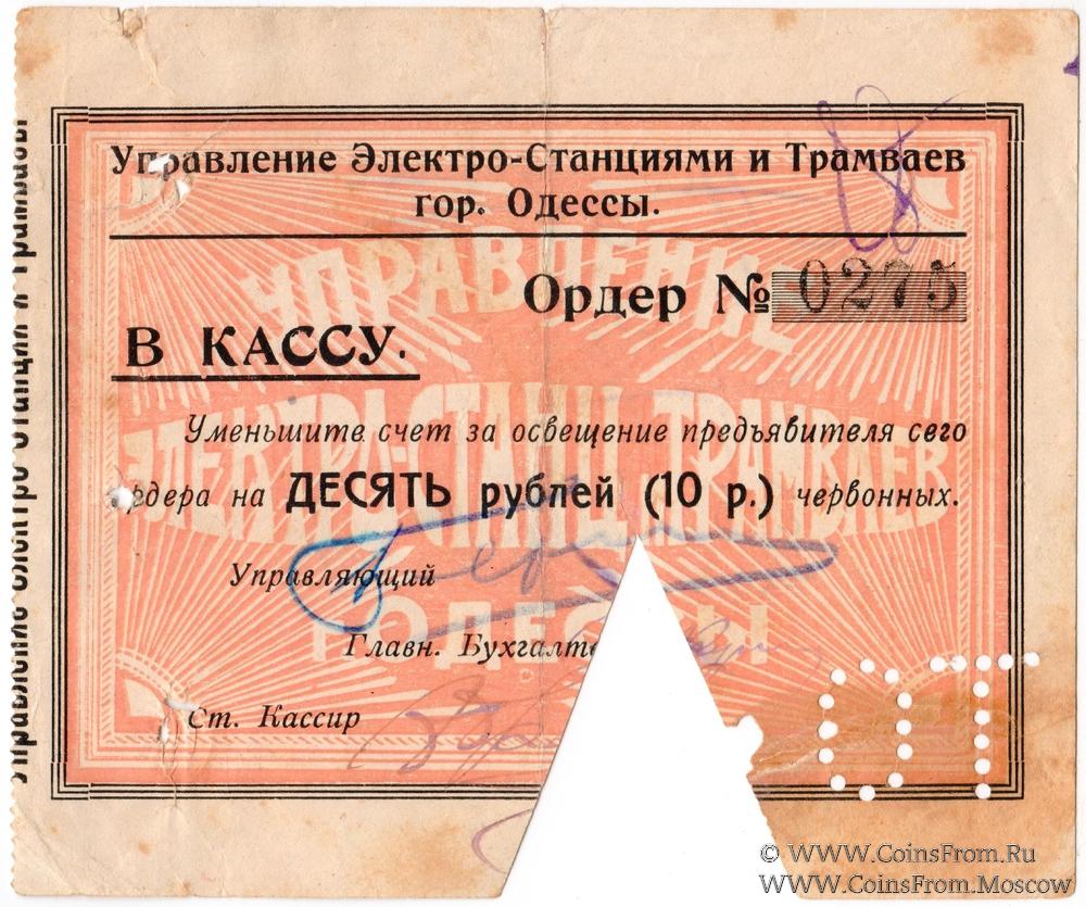 Ордер без даты (1923 г.) в червонном исчислении. Гашение. Перфорация "ОТ". Управление Электро-Станциями и Трамваев гор. Одессы.