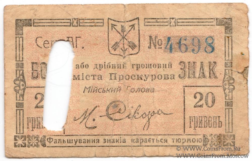 Бона (действительна до 01.10.1919 г.). Серия АГ. Гашение. Реверс перевернут. Проскуровский Городской Банк (Проскурiвський Мiйський Банк).
