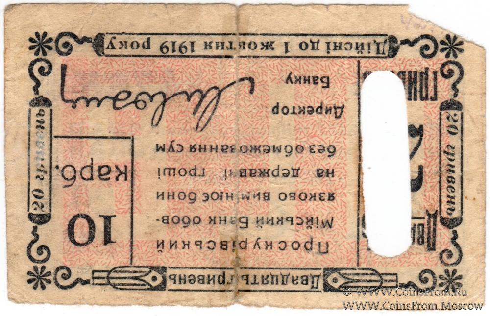 Бона (действительна до 01.10.1919 г.). Серия БГ. Гашение. Реверс перевернут. Проскуровский Городской Банк (Проскурiвський Мiйський Банк).