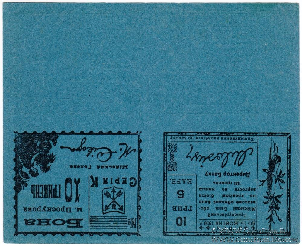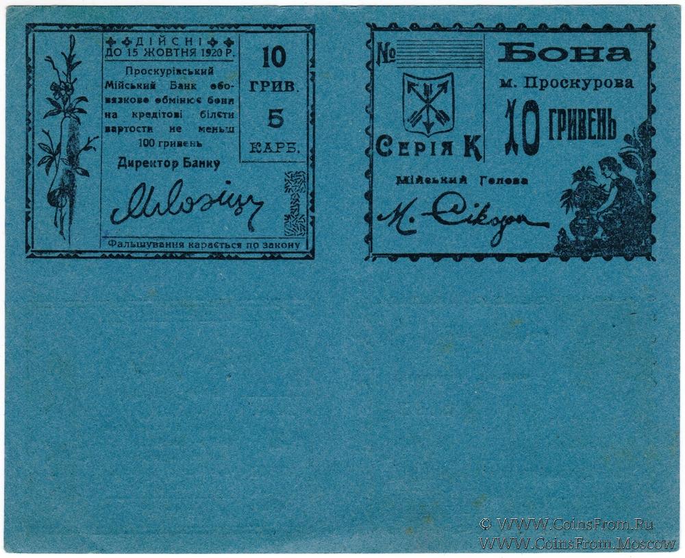 10 гривен (5 карбованцев) 1920 г. (Проскуров) БРАК (ПРОБА / ОБРАЗЕЦ)