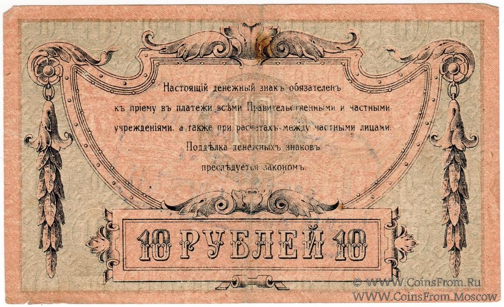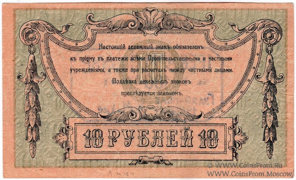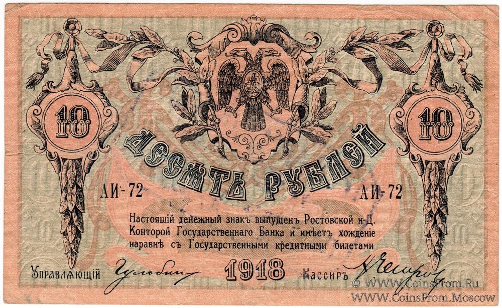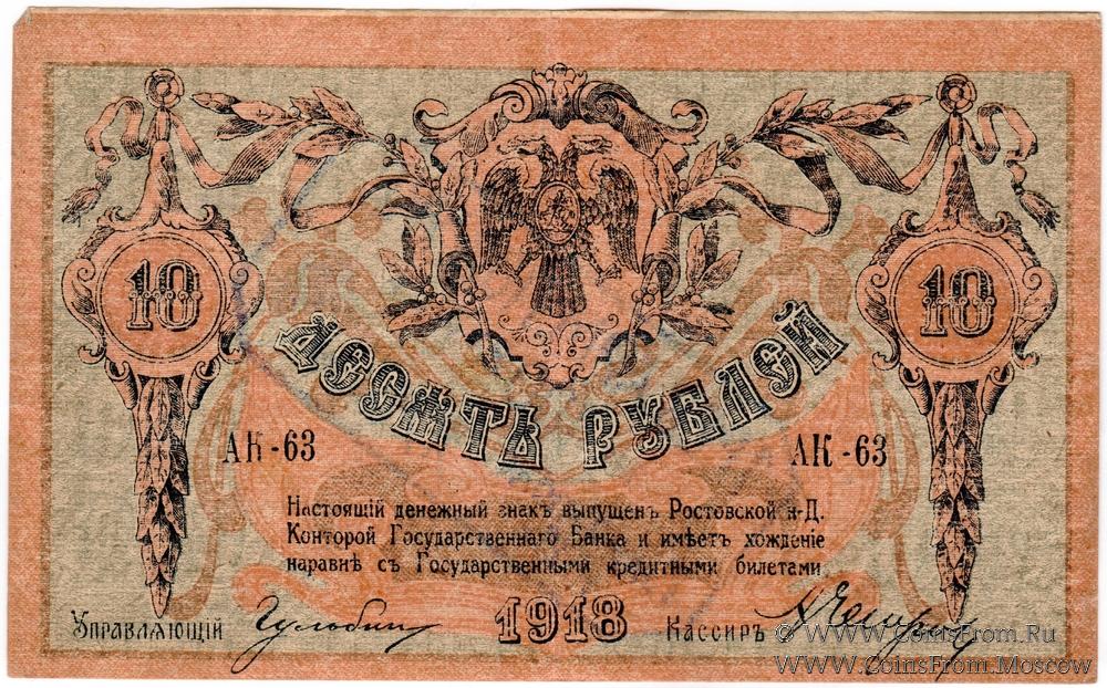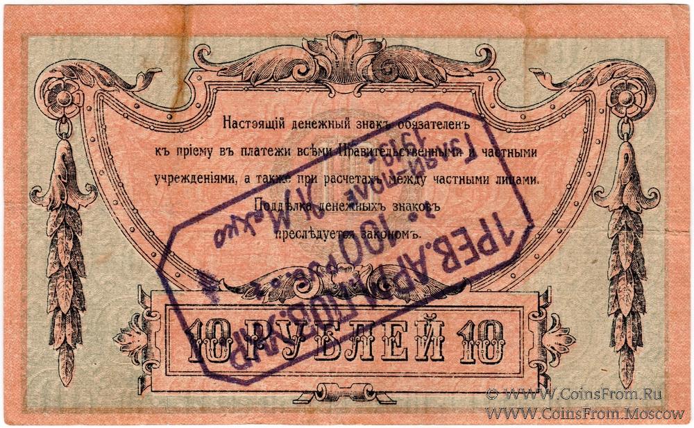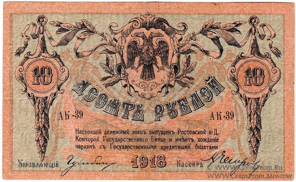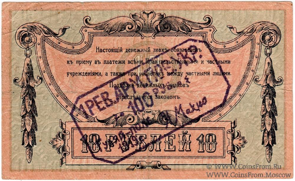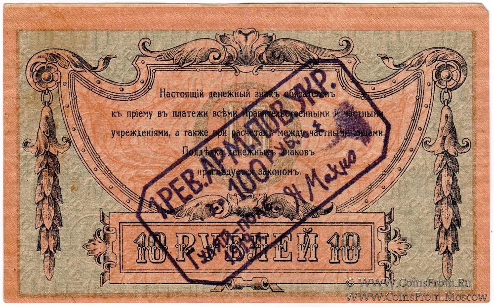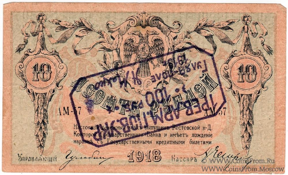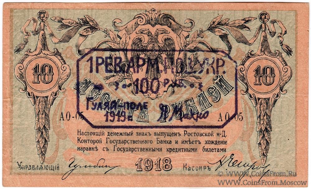 Денежный знак 10 рублей 1918 г. Ростовской на Дону Конторы Государственного Банка с надпечаткой (штампом) на аверсе или реверсе с обозначением нового номинала (100 рублей).